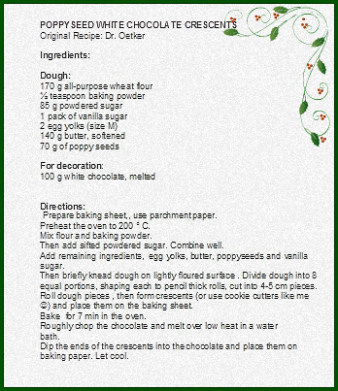 I promised you in my last post about Chocolate Delight Cookies to post the recipe for the White Chocolate Crescents, so here it is :)